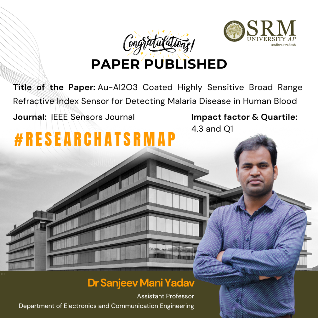 Dr Sanjeev Mani Yadav, Assistant Professor from the Department of Electronics and Communication Engineering, has published a cutting-edge research paper titled “Au-Al2O3 Coated Highly Sensitive Broad Range Refractive Index Sensor for Detecting Malaria Disease in Human Blood” in the IEEE Sensors Journal with an impact factor of 4.3. This research focuses on developing a highly sensitive biosensor using photonic crystal fibres and a technique called surface plasmon resonance (SPR) to detect changes in the refractive index, which is how much light bends when it enters a material. This biosensor can also detect malaria in the human body.