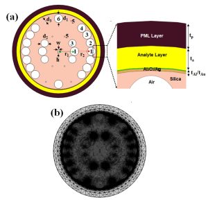 1. Biosensor Basics: The sensor uses a combination of a special crystal fibre and a metal surface (a mix of aluminium oxide and gold) to create a reaction when light hits it. This reaction is called SPR and it helps in detecting tiny changes.