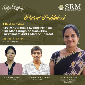 In a significant advancement for aquaculture technology, Dr K A Sunitha, Associate Professor in the Department of Electronics and Communication Engineering, along with her B.Tech ECE students Ms B Harshitha and Mr B Taraka Rameswara Kanaka Durga Prasad, have made headlines with their latest invention. The team has successfully filed and published a patent for “A Fully Automated System for Real-Time Monitoring of Aquaculture Environment and a Method Thereof.” The application number 202441034671, has been officially recorded in the Patent Office Journal, marking a milestone for the team and the institution they represent.