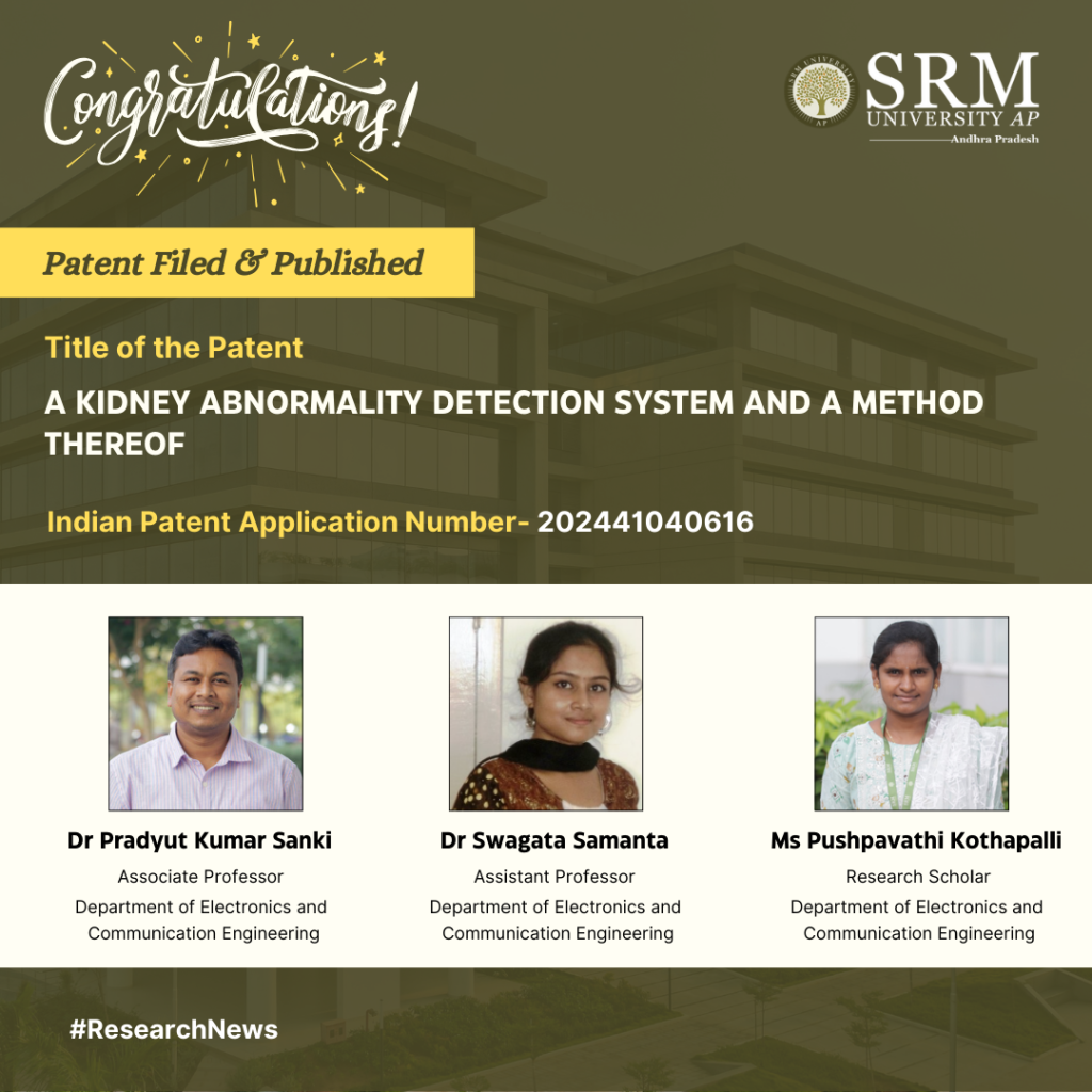 Dr Pradyut Kumar Sanki, Dr Swagata Samanta, and research scholar Ms Pushpavathi Kothapalli from the Department of Electronics and Communication Engineering published their patent titled “A Kidney Abnormality Detection System And a Method Thereof,” with Application No. 202441040616. This innovative method, which utilises advanced deep learning techniques, promises to revolutionise the accuracy and efficiency of kidney disease diagnosis. With the potential for widespread clinical adoption, this technology aims to enhance patient care, offering a brighter future for kidney disease detection and treatment.