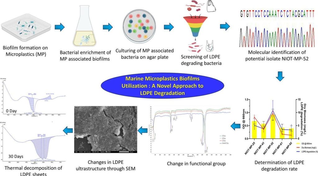 This research offers a sustainable solution to marine plastic pollution by identifying native bacteria capable of degrading low-density polyethylene (LDPE), a common plastic pollutant. The most efficient strain, NIOT-MP-52, showed significant potential for breaking down plastic, indicating its practical use in eco-friendly bioremediation systems like biofilters or wastewater treatment setups. Socially, this approach supports healthier marine ecosystems, reduces human exposure to microplastics, and encourages nature-based waste management strategies, potentially creating green jobs in coastal communities.