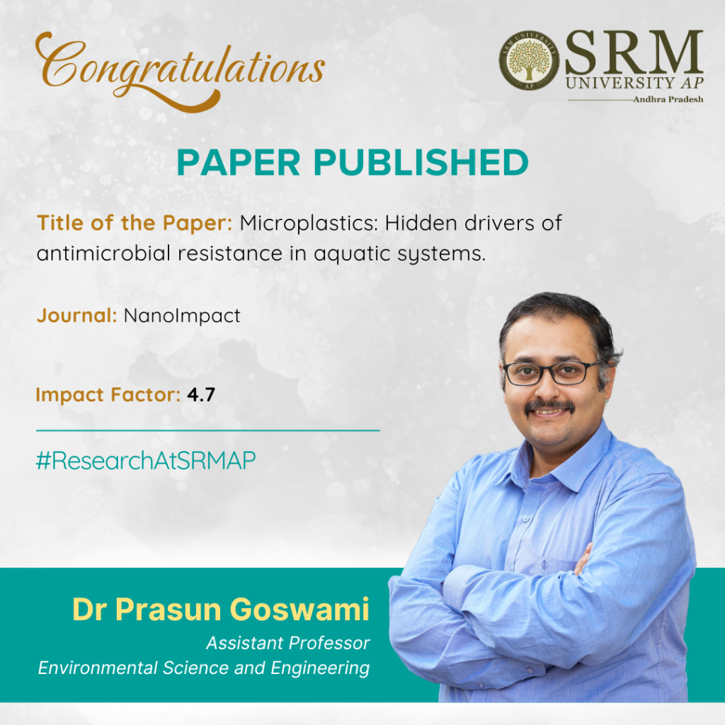 Dr Prasun Goswami, Assistant Professor from the Department of Environmental Science and Engineering, published a paper titled “Microplastics: Hidden drivers of antimicrobial resistance in aquatic systems”, in the Q1 journal, NanoImpact. His research reveals a concerning connection between microplastics and antimicrobial resistance in oceans. The study uncovers how microplastics in our oceans can harbour antibiotic-resistant pathogens, posing significant threats to marine ecosystems and human health. The paper not only sheds light on the topic but also proposes essential steps to better understand and manage the emerging threat.