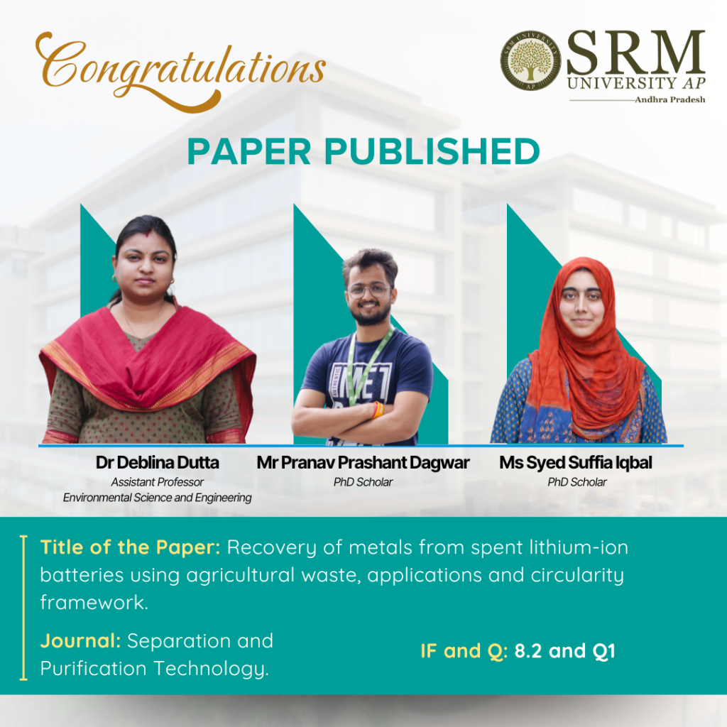 What happens when you can use natural waste like orange peels and rice husks to extract valuable metals from old batteries, electric vehicles, etc.? Exploring innovative and eco-friendly methods to recover useful metals, Dr Deblina Dutta, Assistant Professor, Department of Environmental Science and Engineering, and her research scholars, Ms Syed Suffia Iqbal and Mr Pranav Prashant Dagwar, have published a paper titled “Recovery of metals from spent lithium-ion batteries using agricultural waste, applications and circularity framework” in the prestigious Q1 journal Separation and Purification Technology having an impact factor of 8.2.