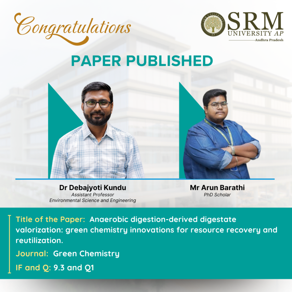 The proactive approach of Green Chemistry is driven by the cardinal rule of prevention rather than remediation of pollution. Analysing various eco-friendly ways to reduce waste, improve recycling, and help industries and farmers benefit from organic waste, Dr Debajyoti Kundu, Assistant Professor from the Department of Environmental Science and Engineering and his scholar Mr Arun Bharati, has published a paper titled “Anaerobic digestion-derived digestate valorization: Green chemistry innovations for resource recovery and reutilization”, in the Q1 journal Green Chemistry having an impact factor of 9.3.