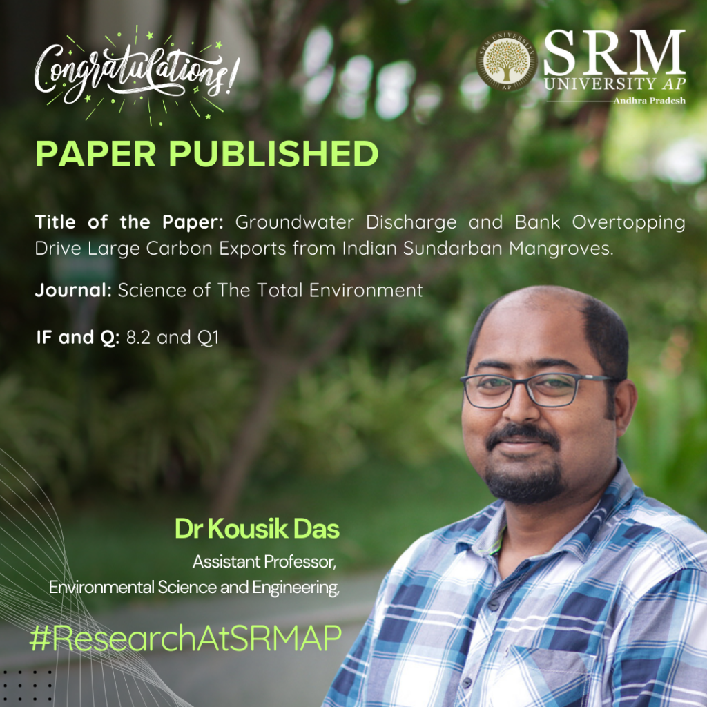 The Sundarbans represent the largest mangrove system on Earth, covering >10,000 km2. These mangroves can export a vast amount of aquatic carbon that can be potentially sequestered for millennia. Dr Kousik Das, Assistant Professor at the Department of Environmental Science and Engineering, collaborates with Southern Cross University, Australia and IIT Kharagpur to conduct breakthrough research to analyse and estimate the carbon flux between the Sunderbans and the Bay of Bengal. He has published a research paper titled “Groundwater discharge and bank overtopping drive large carbon exports from Indian Sundarban mangroves” in the Q1 journal Science of The Total Environment, having an impact factor of 8.2.