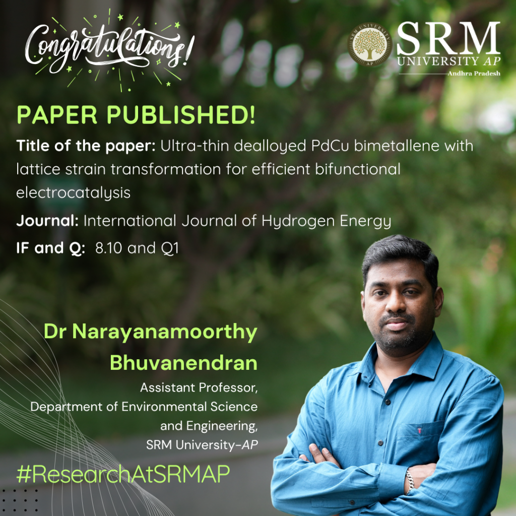 Dr Narayanamoorthy Bhuvanendran, Assistant Professor in the Department of Environmental Science and Engineering, has published his research work as an article titled “Ultra-thin Dealloyed PdCu Bimetallene with Lattice Strain Transformation for Efficient Bifunctional Electrocatalysis” in the esteemed International Journal of Hydrogen Energy, which has an impact factor of 8.10. His work underscores the development of 2D PdCu bimetallene with improved structural and electronic properties displaying super-catalytic behaviour.