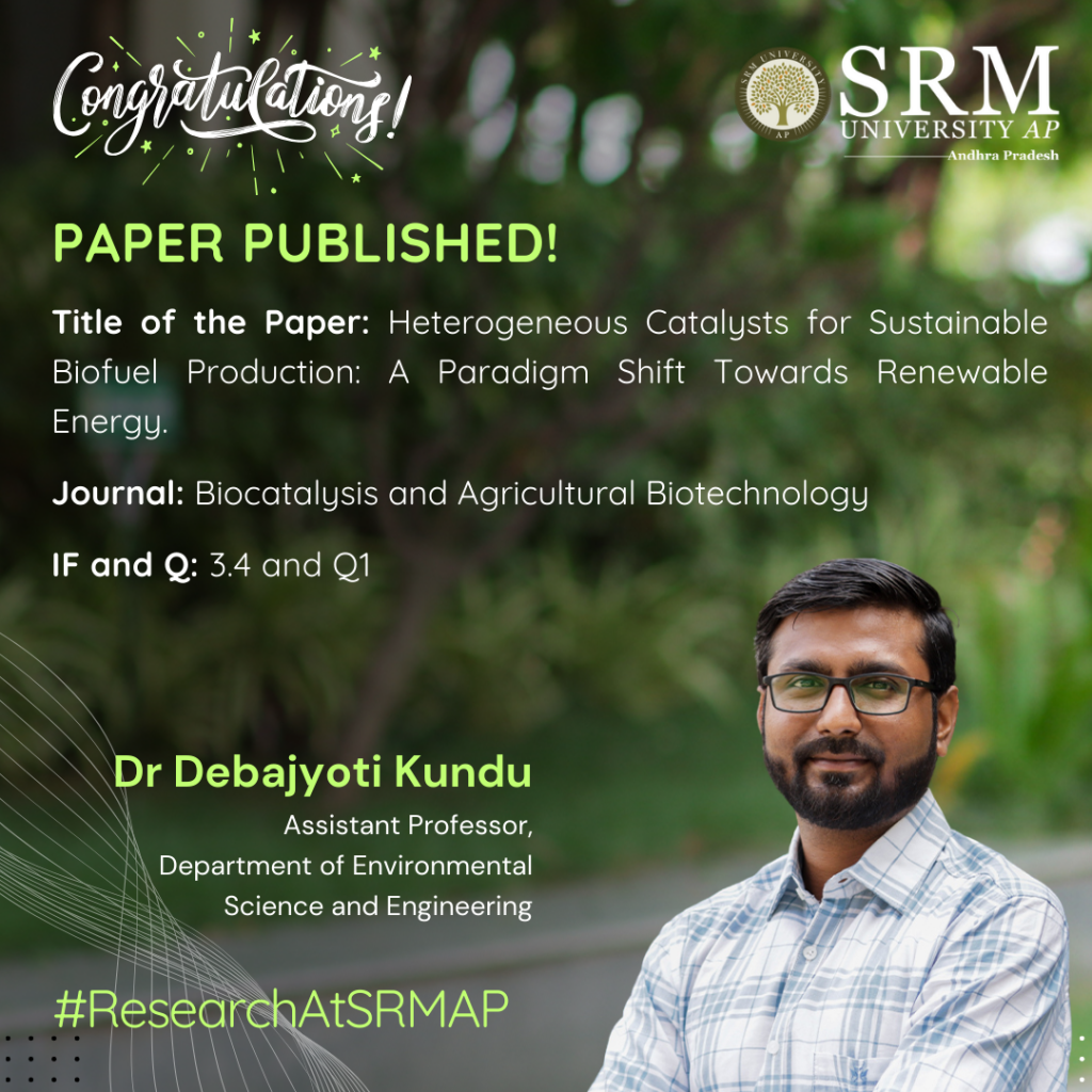 In the quest for sustainable energy solutions, Dr Debajyoti Kundu, from the Department of Environmental Science and Engineering, examines the potential of biofuels through his research paper – “Heterogeneous Catalysts for Sustainable Biofuel Production: A Paradigm Shift Towards Renewable Energy.” The paper highlights the importance of heterogeneous catalysts for improving biofuel production efficiency. The research also suggests future research to support sustainable energy practices.