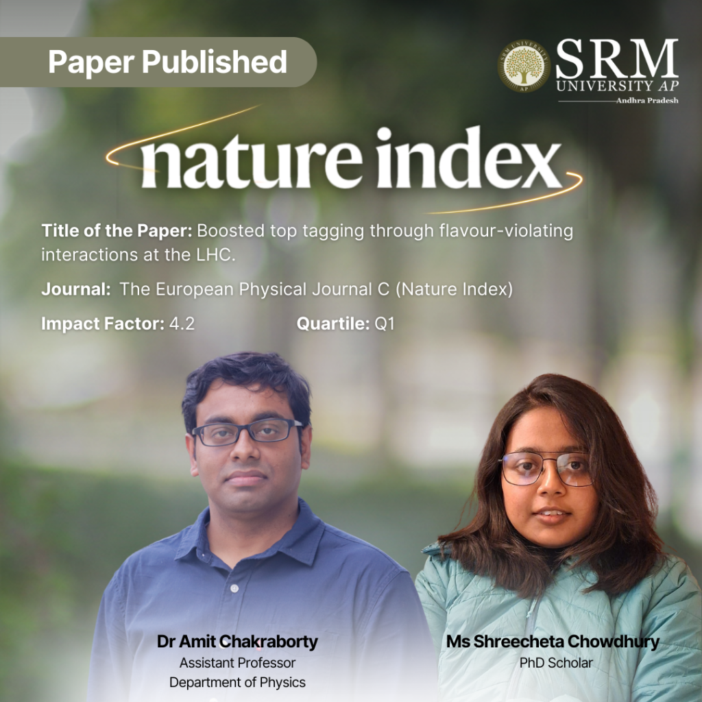 Dr Amit Chakraborty, Assistant Professor in the Department of Physics and Ms Shreecheta Chowdhury, PhD Scholar, have co-authored a research paper titled “Boosted top tagging through flavour-violating interactions at the LHC”, which has been published in the European Physical Journal C (Nature Index), Q1 Journal having an impact factor 4.2.