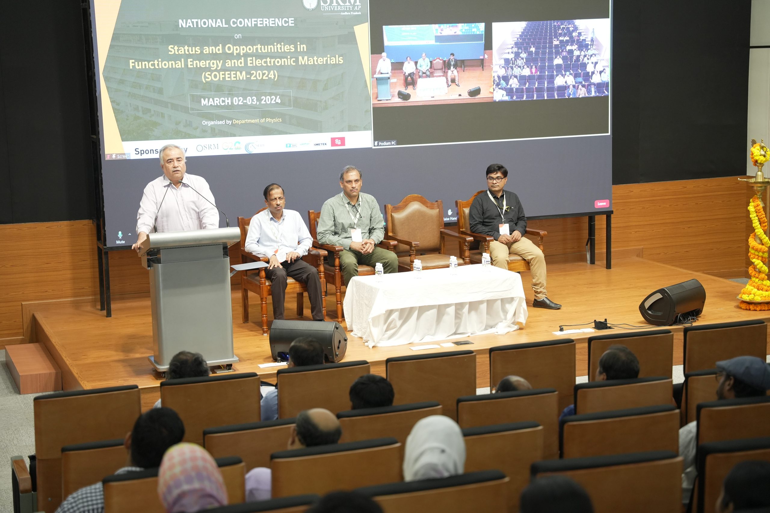 SRM University-AP hosted a national conference on “Status and Opportunities in Functional Energy and Electronic Materials” (SOFEEM-2024) on March 02-03, 2024. The conference was organised by the Department of Physics and was supported by the Department of Science and Technology, Government of India. The conference brought together about 100 participants from various reputed institutions, national laboratories, and universities from India. They shared their research outcomes and discussed the various frontier energy technologies and smart electronic devices.