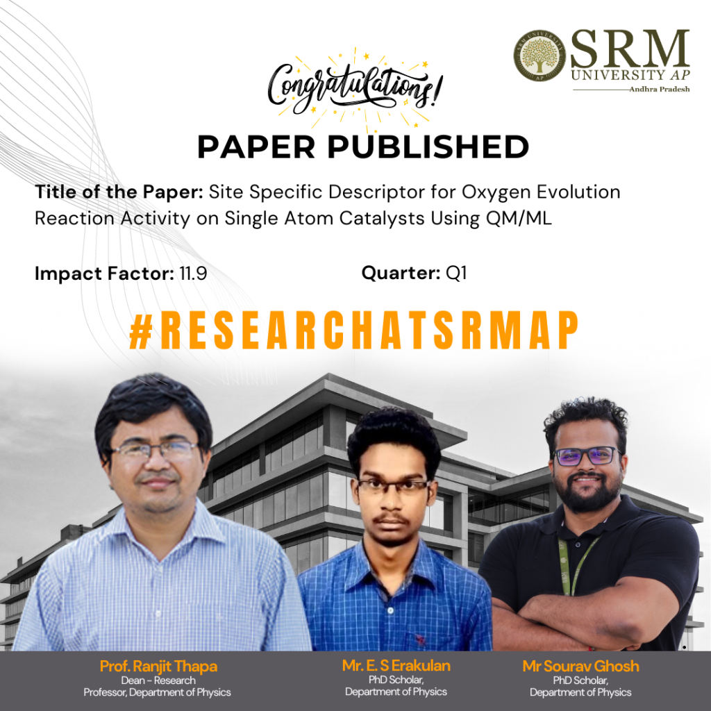 Prof. Ranjith Thapa in collaboration with two of his research scholars, Mr E. S. Erakulan Mr Sourav Ghosh and has come up with a groundbreaking research that has resulted in the publication of a scholarly paper titled, Specific Descriptor for Oxygen Evolution Reaction Activity on Single Atom Catalysts Using QM/ML.