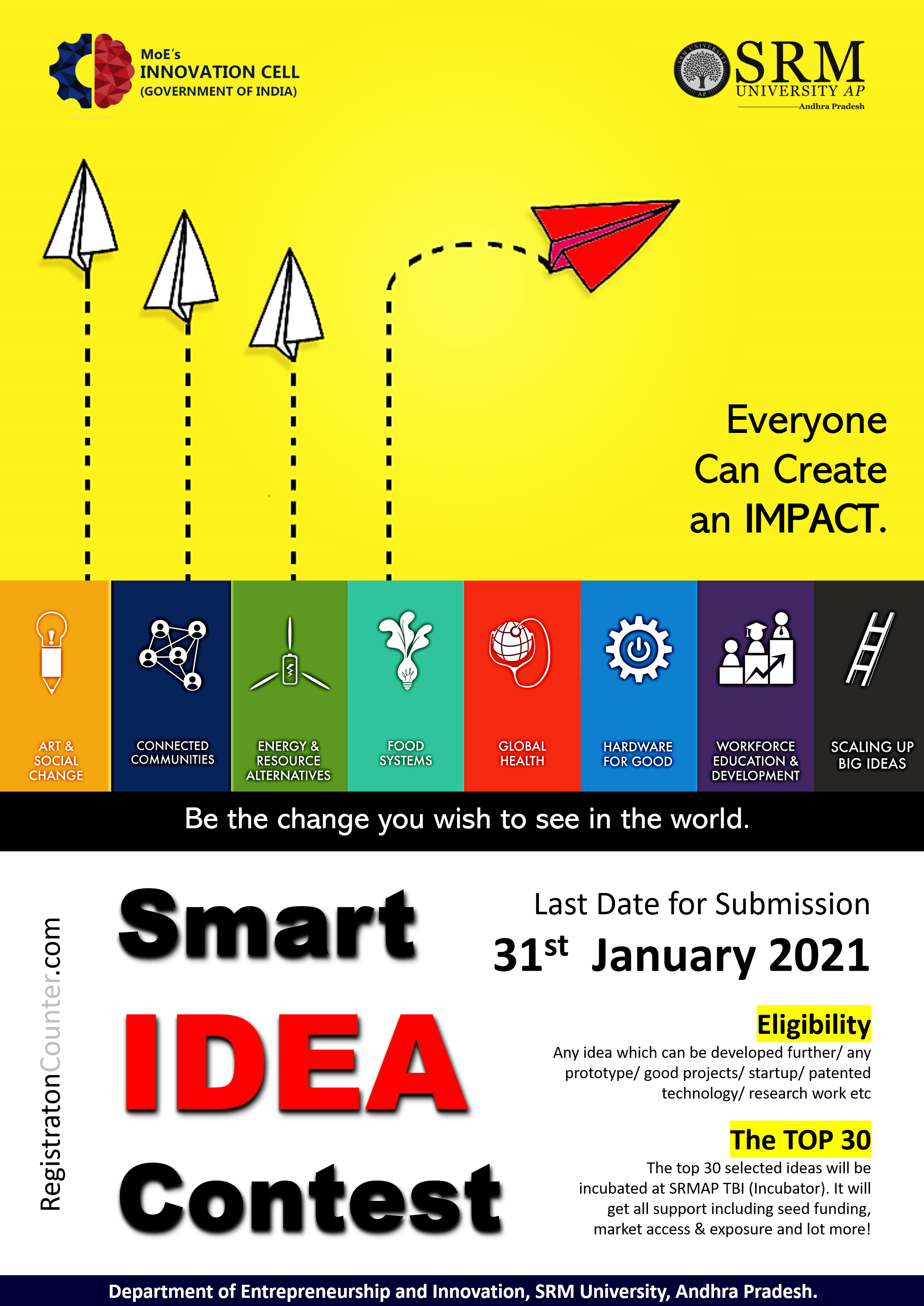The innovation cell of SRM University-AP, Andhra Pradesh has arranged the Smart Idea contest on January 31, 2020. Ideated by Mr Udayan Bakshi, Associate Director, Department of Innovation and Entrepreneurship, the contest aims at ushering individuals to envisage a better world through innovative ideas, concepts, and aspirations. During this competition, the participants would be presenting their impactful concept, prototype, project, research, and business idea, to unravel problems of the society.