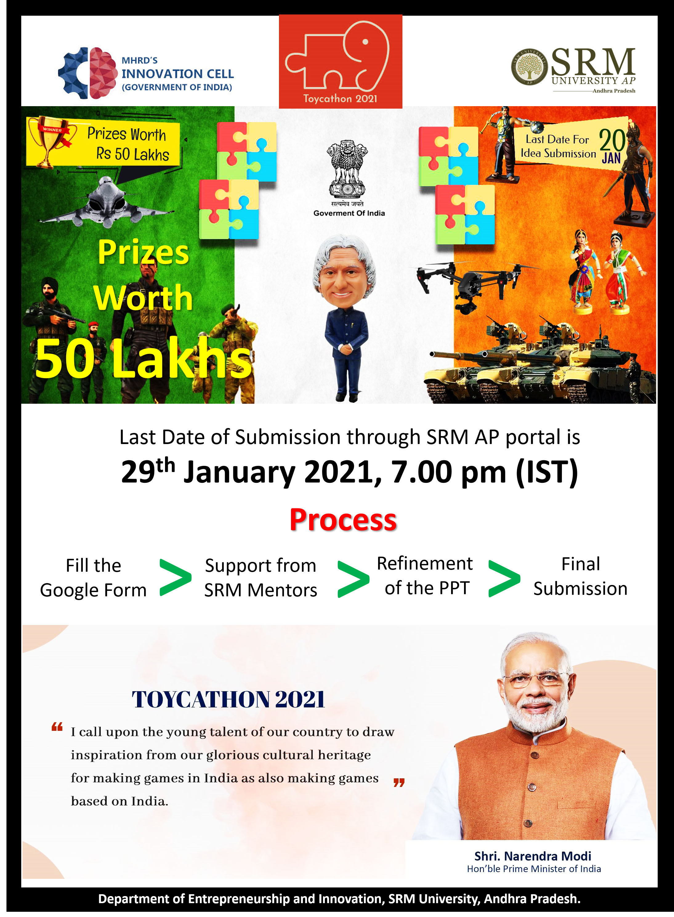 The smart minds of SRM University-AP, Andhra Pradesh receives an opportunity to present their creative skills in the Toycathon-2021. Organized by the Ministry of Education’s Innovation Cell, Toycathon- 2021 challenges India’s contemporary minds to conceptualize Toy and Games inspired by Indian civilization, history, culture, mythology, and ethos. This unique opportunity will also enable exceptional innovators to win prizes worth Rs. 50 lakhs. In addition, the winning team’s efforts will be commercialized with support from the industry and investors.