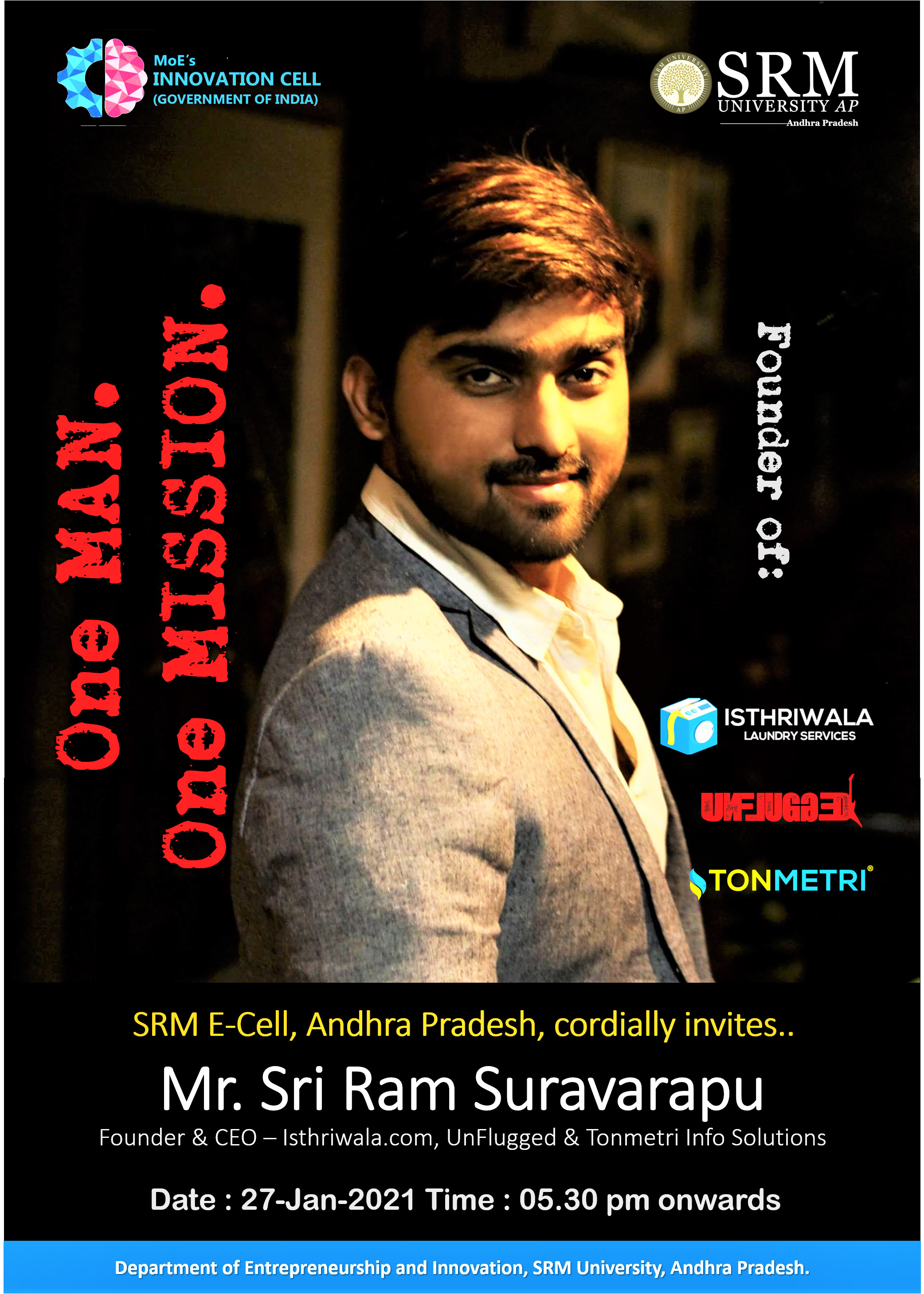 In the glorious launch of e-cell presented by the Innovation, Design and Entrepreneurship Academy (IDEA), SRM University-AP, Andhra Pradesh, Mr Sri Ram Suravarapu, Founder & CEO – Isthriwala, Tonmetri Info Solutions, and The UnFlugged Band, has been invited as the eminent guest for the larger benefit of the community, and to engage the students in an evocative fashion.
