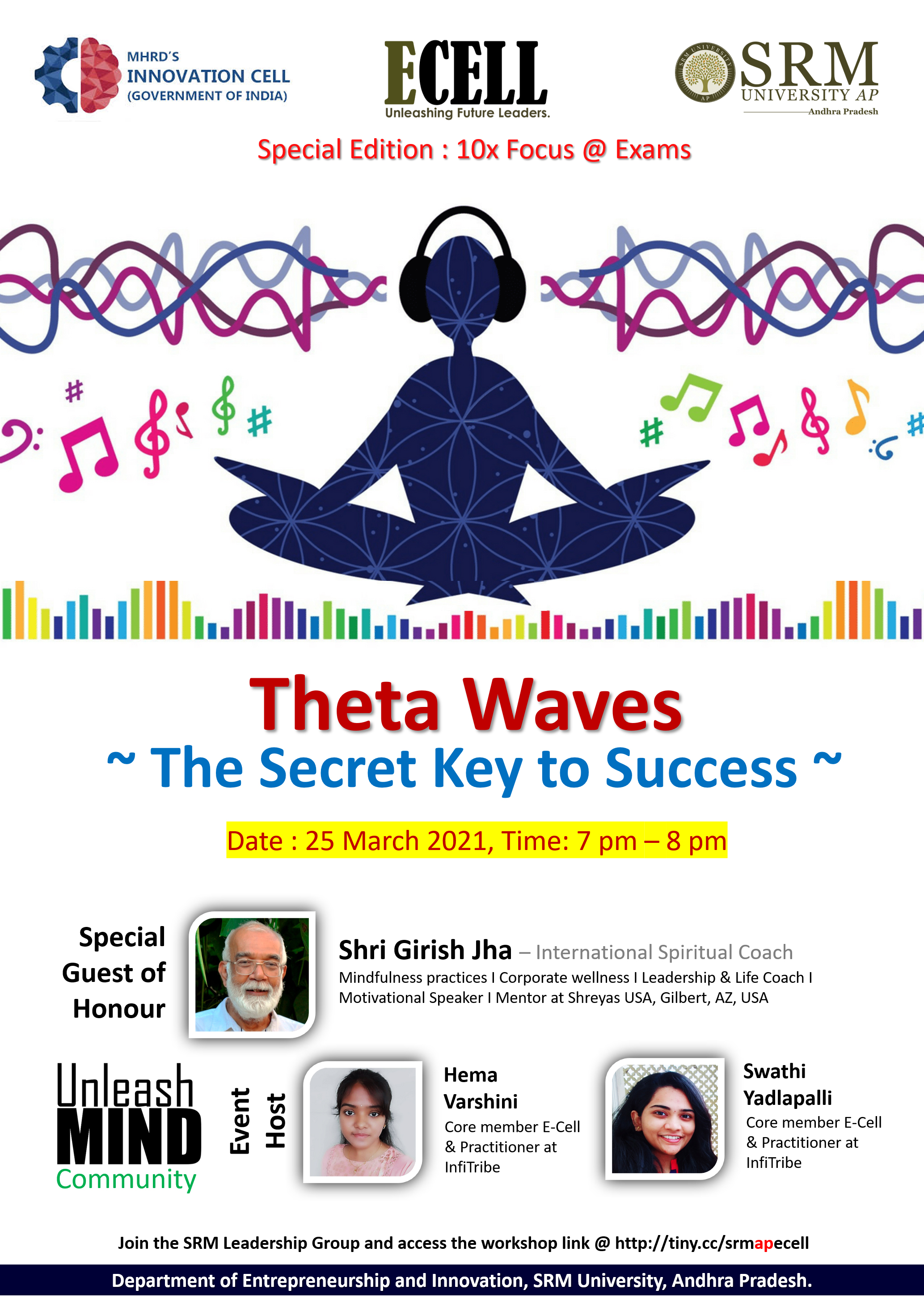 Join the exciting event Theta Waves: 10x Focus @ Exams, organised by Unleash Mind Community – SRM ECell, on March 25, 2021, at 7 pm.