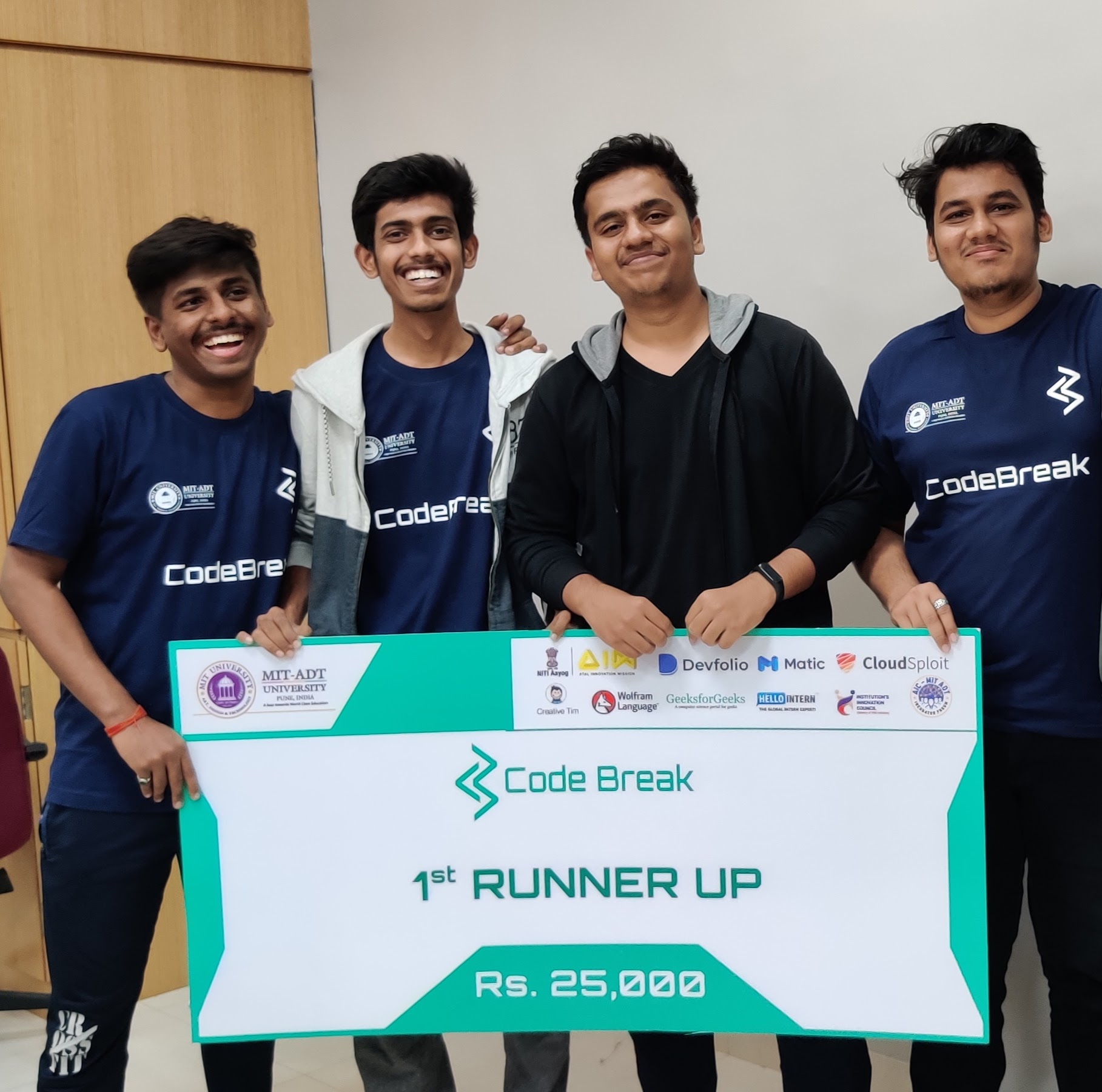 Next tech lab students achieve yet another milestone in Hackathon Codebreak 1.0 organized by MIT ADT University, Pune on 21st and 22nd December, 2019. The team- Rushank Jain, Suraj Maharana, Omkar Ingale, and Ajay Kumar participated from SRM AP in this national level hackathon, where they competed with students from IIIT, BITS, Bennet University, K.J. Somaiya and many more. The panel of judges comprised of experienced personnel from IBM, Siemens, and Xpansion.