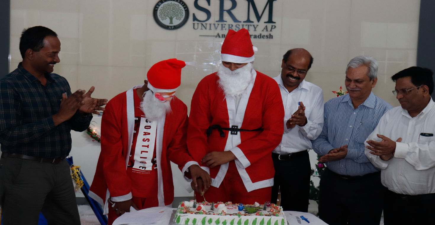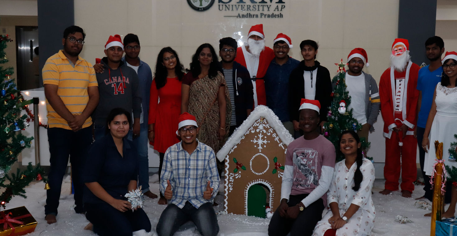 This Christmas, SRM AP campus witnessed a two day grand celebration. The student council and volunteers assisted by the Student Affairs department started the preparation 10 days back. The reception area and the grand staircase was decked up with christmas tree, snowman, gingerbread house and a crib.