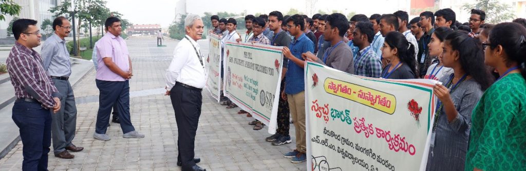 Through the NSS wing SRM Andhra Pradesh delivers social programs to villages (Neerukonda and Kuragallu) and school adoptions (renovations and advisory) blood donation camps, first aid and cancer awareness, cleanliness drives, environment protection (substituting plastics with jute bags,) donations to temples and environment sustainable programs like the university’s 1-acre kitchen garden that grows vegetables as a co-op with local villagers. In partnership with communities SRM AP Amaravati invests in infrastructure projects – working with villagers to build link roads. On campus – mechanised plants and technologies enable the deployment of environment sustainability projects like organic waste management, water harvesting, power conservation units for lights, heating, and generators; sewage treatment plant (treated for gardening and cooling towers) and rooftop solar power generation.
