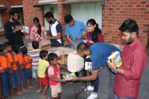 The student members of the club- Hemanth P, Hemanth N, Sathvik P, Jayanth S, Chetan M, Sadwika, and Harini along with their mentor Hemanth, Vineesh Sagar (Manager-Student Affairs), and Neelima Krishnakumar (Student Counsellor) arranged for 240 books, a large cake, and headed off to share their achievement and happiness with the kids at the orphanage.