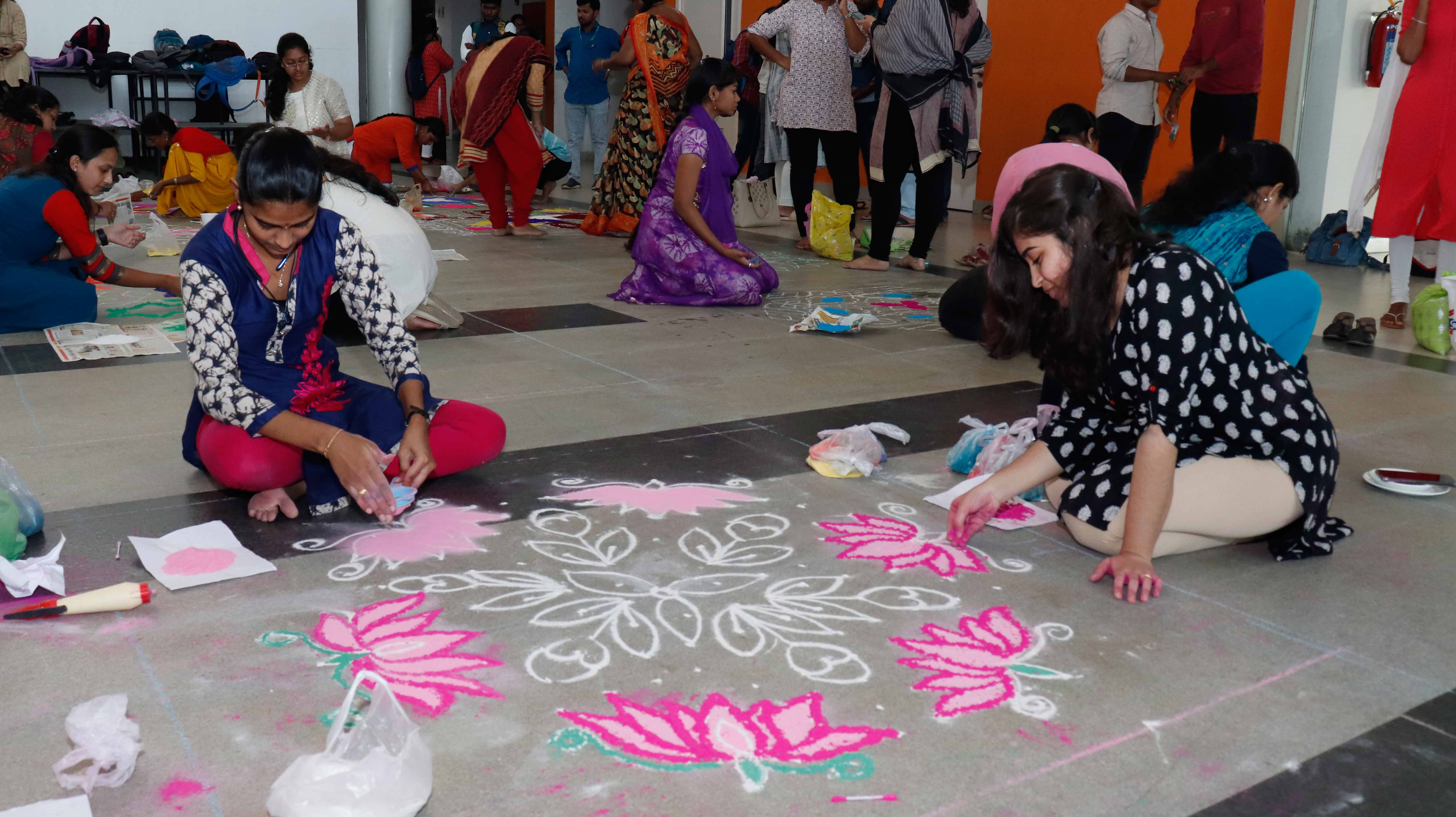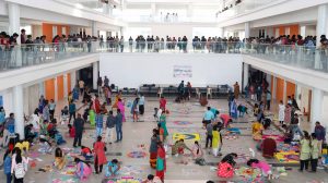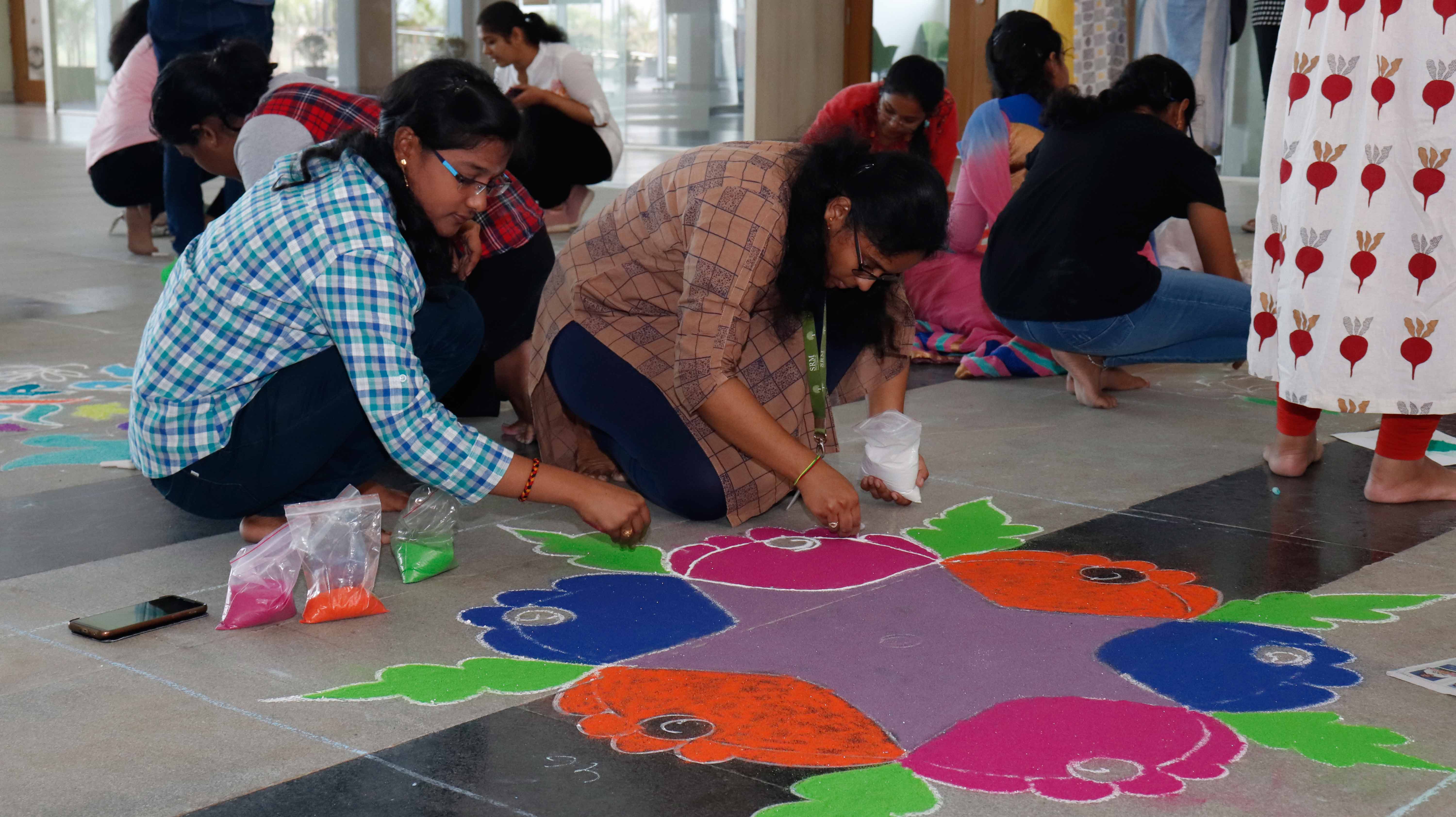 On 25th January, registration for the competition began early in the morning and was closed by 8 a.m. Close to 60 contestants participated, and each were given 5*5 feet of space in the atrium area to make rangoli. Cheered by ample spectators including students and inhabitants of the nearby villages, the participants transformed the floor of the atrium into picturesque blocks of art.