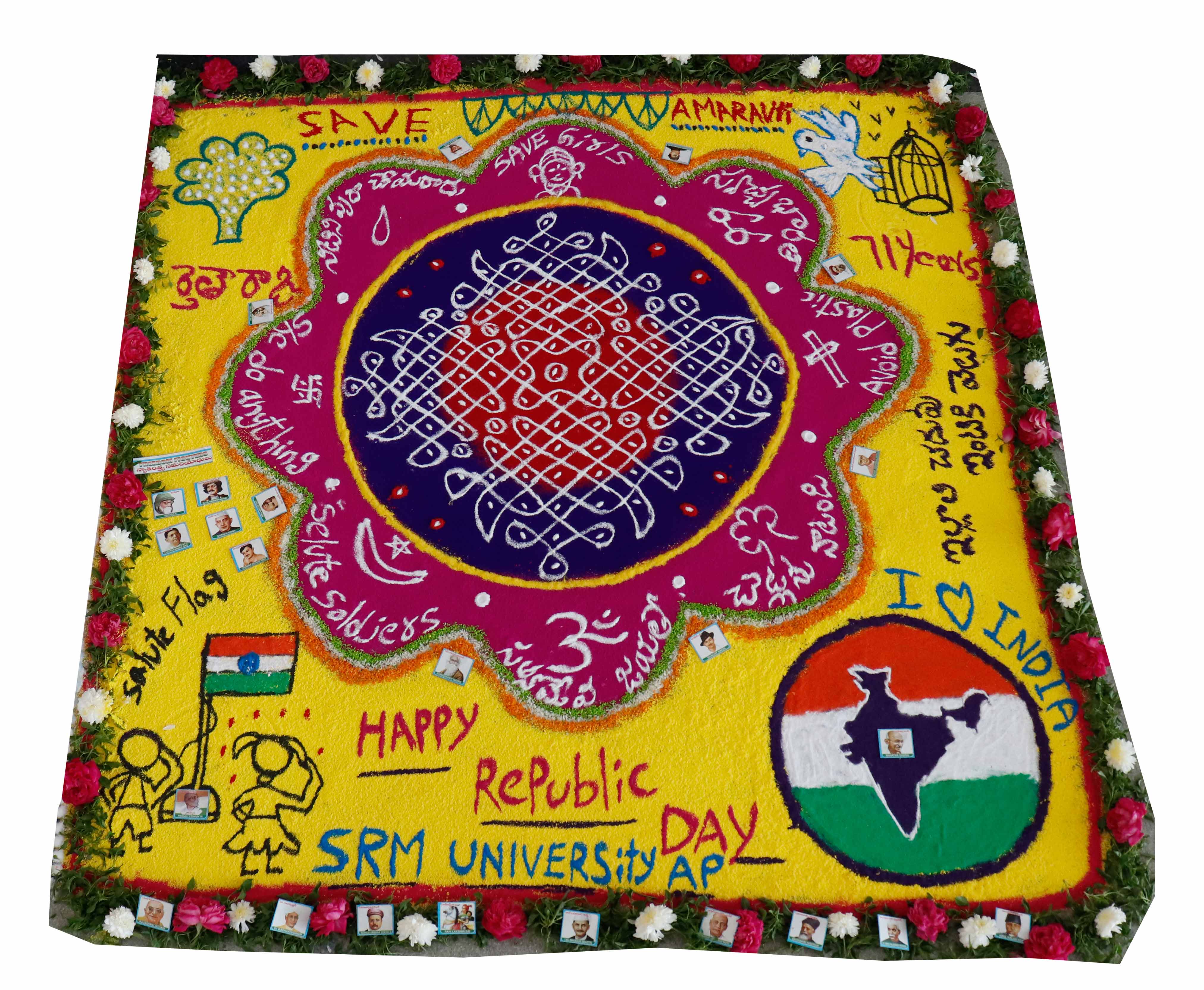 This year SRM AP celebrates Republic Day in the most unconventional way that has enabled the females of the district to come together and rejoice the occasion. Words went out a week ago to the women hailing from the adjoining villages-Nidamarru, Kurugallu, Neerukonda, Pedhaparimi that SRM AP will be hosting Republic Day themed Rangoli competition on 25th January, 2020 which will be open to all the women living in the district, students, faculty, and staff.