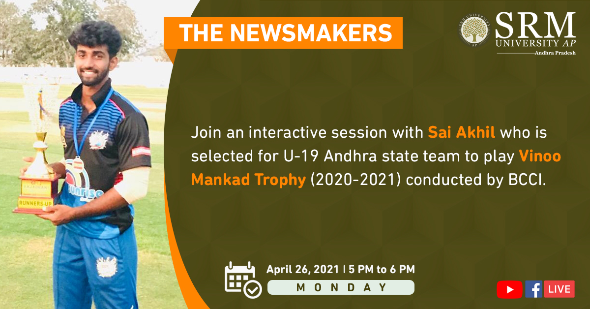 Aspiring young cricketer and second-year BBA student of SRM University-AP, Sai Akhil made to ‘The Newsmakers’ for getting selected into the prestigious Vinoo Mankad Trophy Under-19 Team, 2021. Born and raised in Hyderabad, Akhil started playing cricket from the age of 12 in a neighbouring cricket coaching centre called Crick Summer. Department of Student Affairs has scheduled the event for April 26, 2021, at 5 pm.