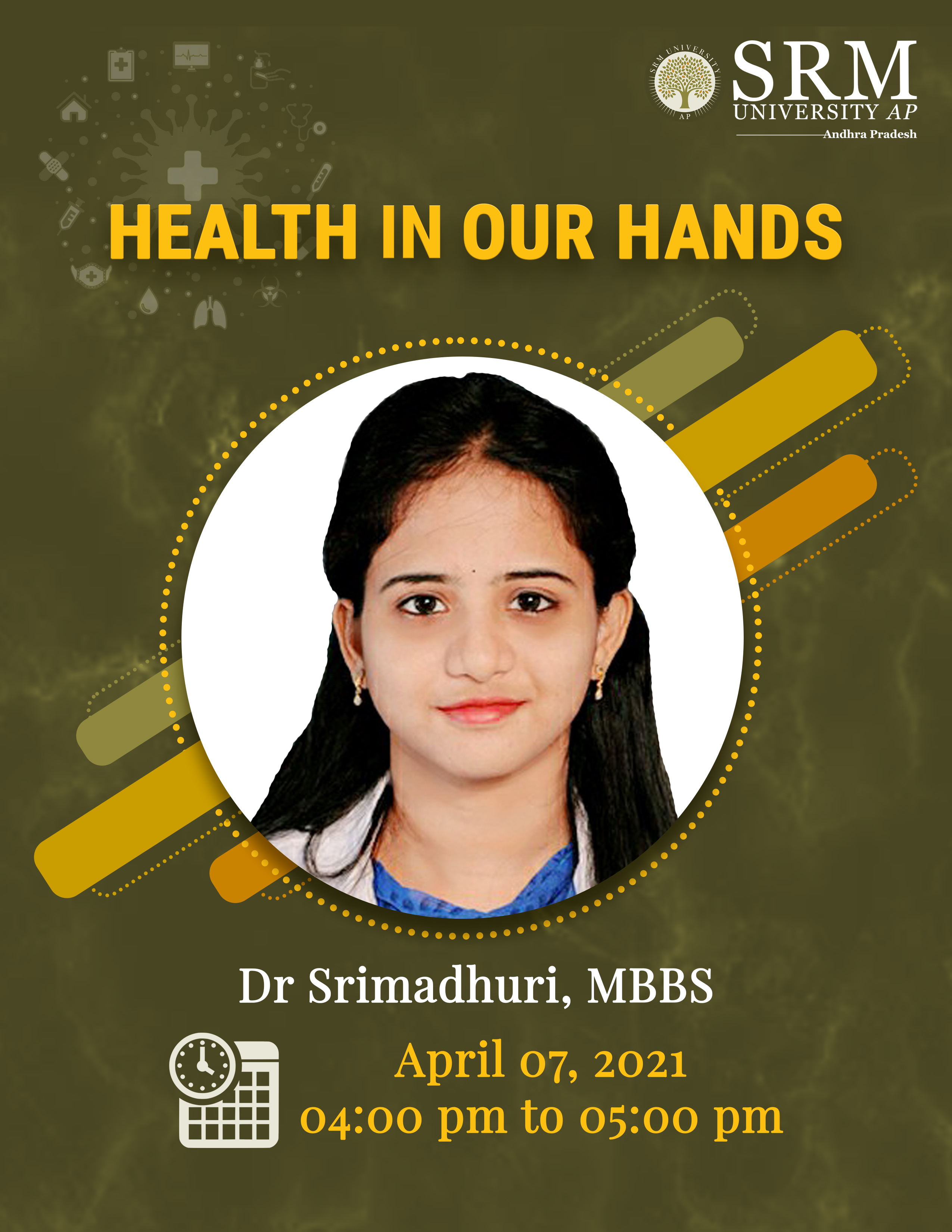 On the auspicious occasion of World Health Day, the Department of Student Affairs organises a very special session for the students of SRM University-AP. As Ralph Waldo Emerson rightly said, “The first wealth is health,” we often forget that. Especially in the thrill of the invigorating youth, students tend to neglect their health and suffer later. Needless to say that we all should remember that health is the most important thing in everyone’s life. A few good practices can keep the diseases away and make your life worthwhile. “Health in Our Hands”, presented by Dr Srimadhuri, will enlighten the students on some substantial problems that the youth of this generation face. She will also share the present scenario regarding COVID-19 and the ideal stand to keep oneself safe from the disease. The session will not be limited to problems related to the students. The faculty and staff will also be benefitted by listening to Dr Srimadhuri’s advice.