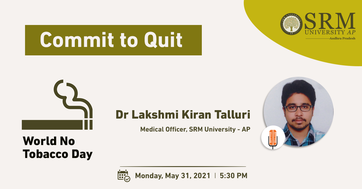SRM University-AP commits to encouraging its associates to raise awareness and spread information about the hazards and realities of tobacco usage on World No Tobacco Day under the slogan “Commit to quit.” Dr Lakshmi Kiran Talluri holds the prestigious position of resident medical officer at SRM University-AP, Andhra Pradesh. He is an experienced medical expert and would provide significant insights to session attendees. Dr Talluri would speak from an expert perspective on the numerous aspects associated with smoking and tobacco intake to educate individuals about previously unknown facts. Therefore, everyone is urged to attend the knowledge-based session on May 31, 2021, at 5:30 p.m.