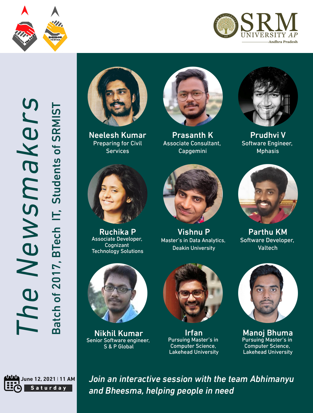 Human life is undergoing significant challenges since the outbreak of Covid-19. Despite the chaos of this difficult time, countless unsung heroes have come forward to pull the distressed out of their sufferings. Among them are Team Abhimanyu and Team Bheeshma, a group of IT graduates from SRM Institute of Science and Technology, Kattankulathur, Chennai. Neelesh Kumar, Prasanth Koyyalagunta, Prudhvi Vishwanadhula, Ruchika Pattjoshi, Vishnu Padmaraju, Parthu M, Irfan, Manoj Bhuma, Dinesh DT, Sai Sandeep, Vudutha Akhil, Akhil Thallada, and M Nikhil Kumar Reddy are young minds aged 24 to 26 pursuing higher studies abroad or employed at reputed MNCs in India. The Department of Student Affairs, SRM University-AP, appreciates their virtuous intentions and invites the teams on “Newsmakers” on June 12, 2021, at 11.00 am to share their incredible experiences on the path of serving humanity.