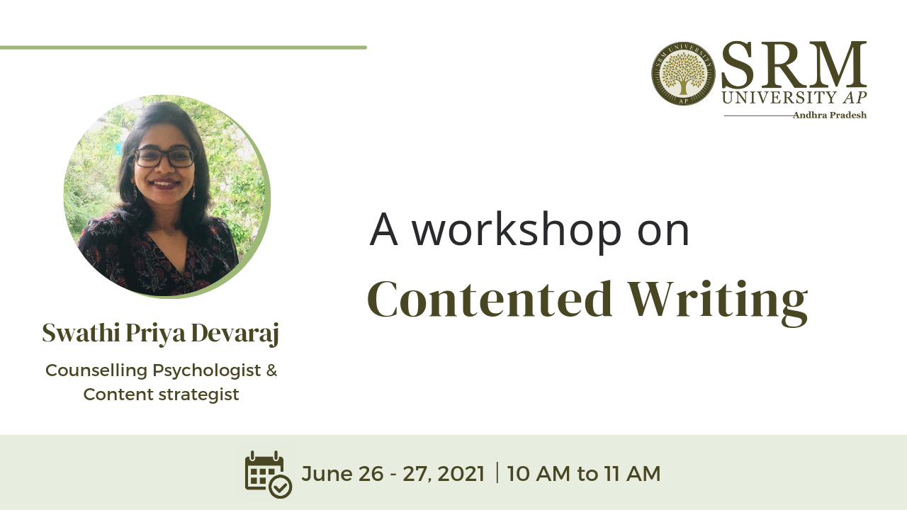 The Department of Students’ Affairs is hosting a free skill development workshop on June 26 and 27, 2021, at 10.00 am, titled “Contended Writing” for aspiring writers. Ms Swathi Priya Devaraj, the guest speaker, is a passionate strategic content writer by choice and a Counselling Psychologist and researcher by profession. This virtual workshop is intended for people who want to be writers and create blog posts, articles, stories, etc.