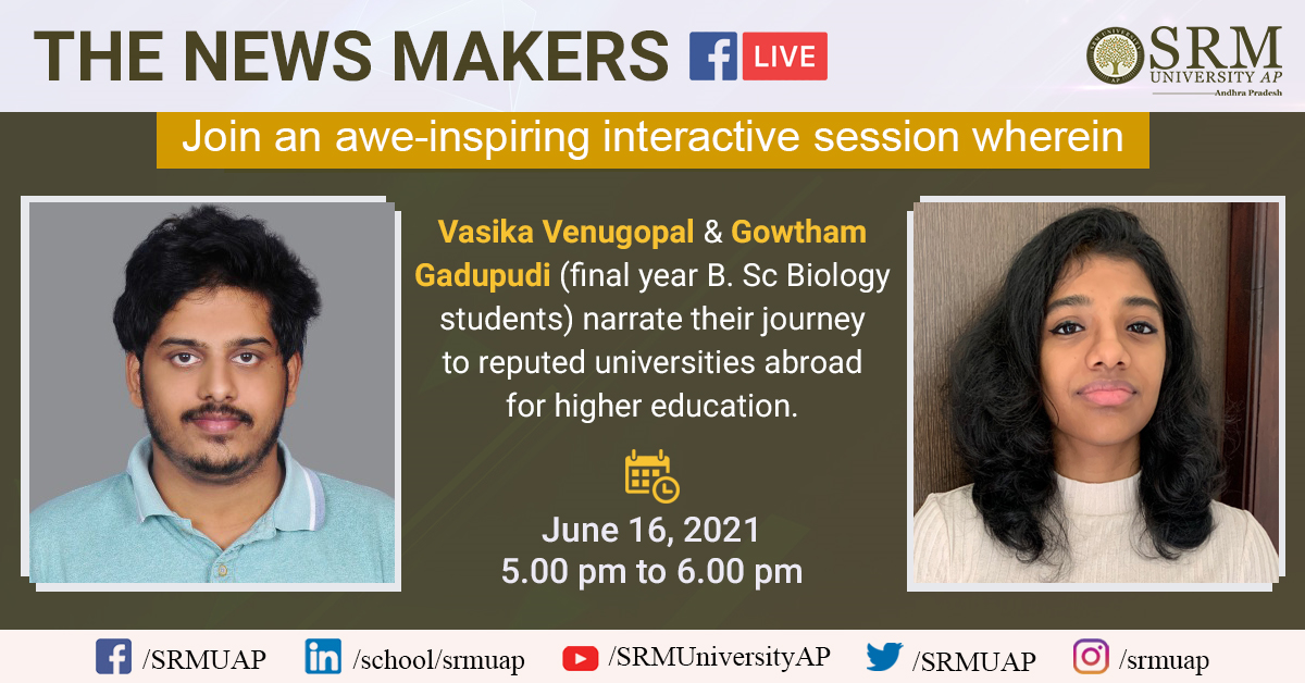 Vasika Venugopal and Gadupudi Gowtham, 3rd-year BSc Biology students have achieved the extraordinary by securing admissions to prominent global universities. The Department of Student Affairs, SRM University-AP, Andhra Pradesh invites them to “Newsmakers” on June 16, 2021, at 5.00 pm to have a conversation apropos of their journey to world-renowned universities.