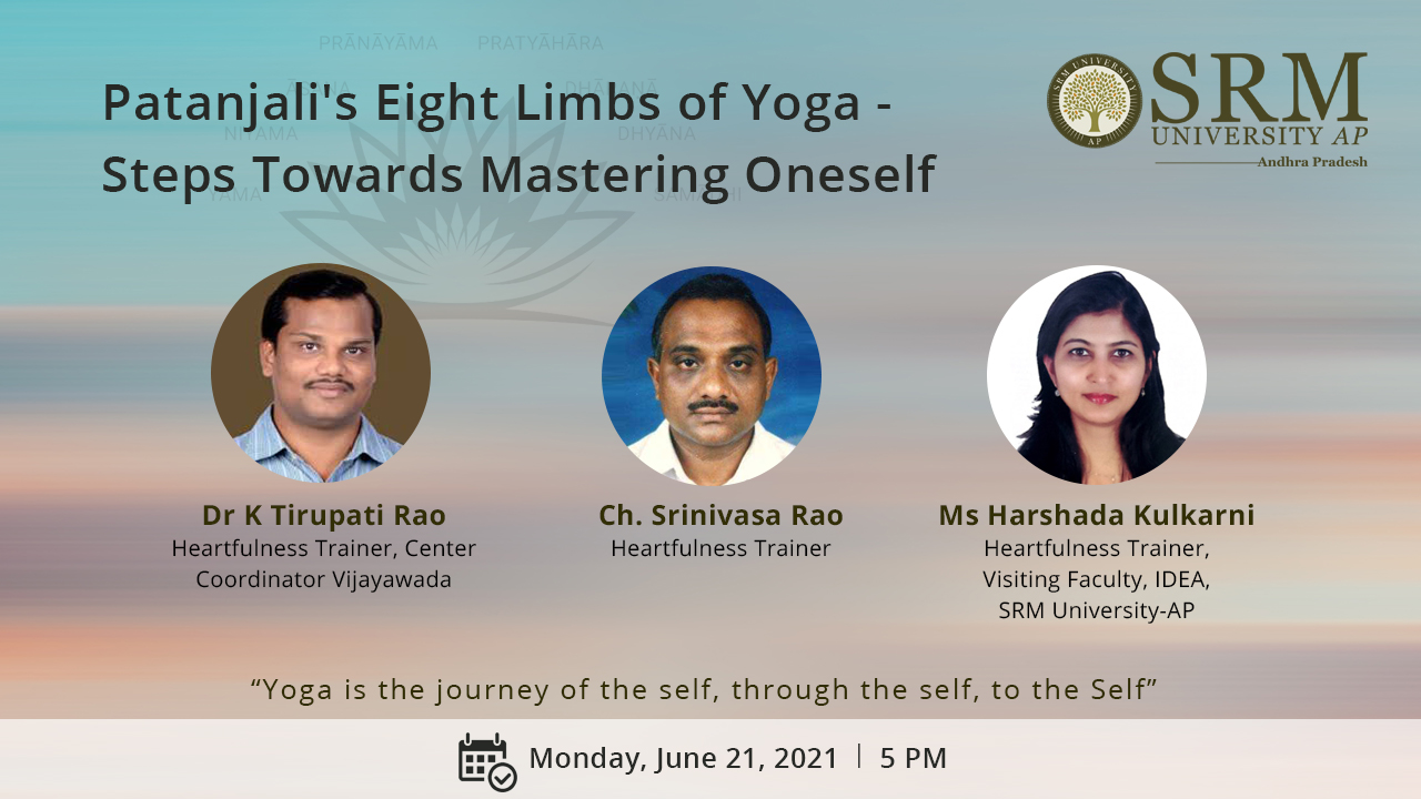 People across the world are celebrating the seventh international day of Yoga on the theme “Yoga for well-being”. As the celebration has been scaled down due to the pandemic, SRM University-AP, Andhra Pradesh is celebrating the day by conducting a virtual talk on “Patanjali’s Eight Limbs of Yoga-Steps Towards Mastering Oneself” on June 21, 2021, at 5.00 pm.