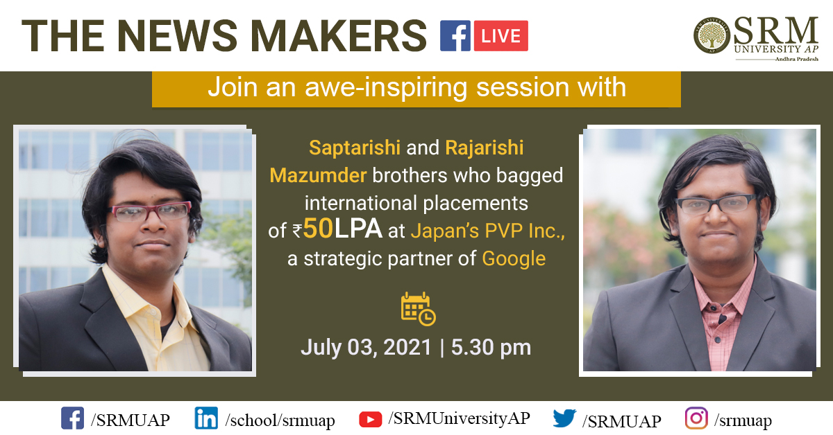 SRM University-AP is extremely proud to announce the accomplishments of the Saptarshi and Rajarshi Mazumder brothers, two magnificent Computer Science Engineering graduates from the Maiden Batch-2017. The duo bagged jobs at Japan’s PVP Inc., a strategic partner of Google Japan, with a whopping 50 LPA salary packages each, making the achievement the highest salary package amongst the 96 per cent of students who secured placements in the campus recruitment drive. The Department of Students’ Affairs has invited Saptarshi and Rajarshi to the upcoming segment of “The Newsmakers” on July 03, 2021, at 5:30 pm., where they will share their journey from SRM University-AP to a top-tier global organisation.