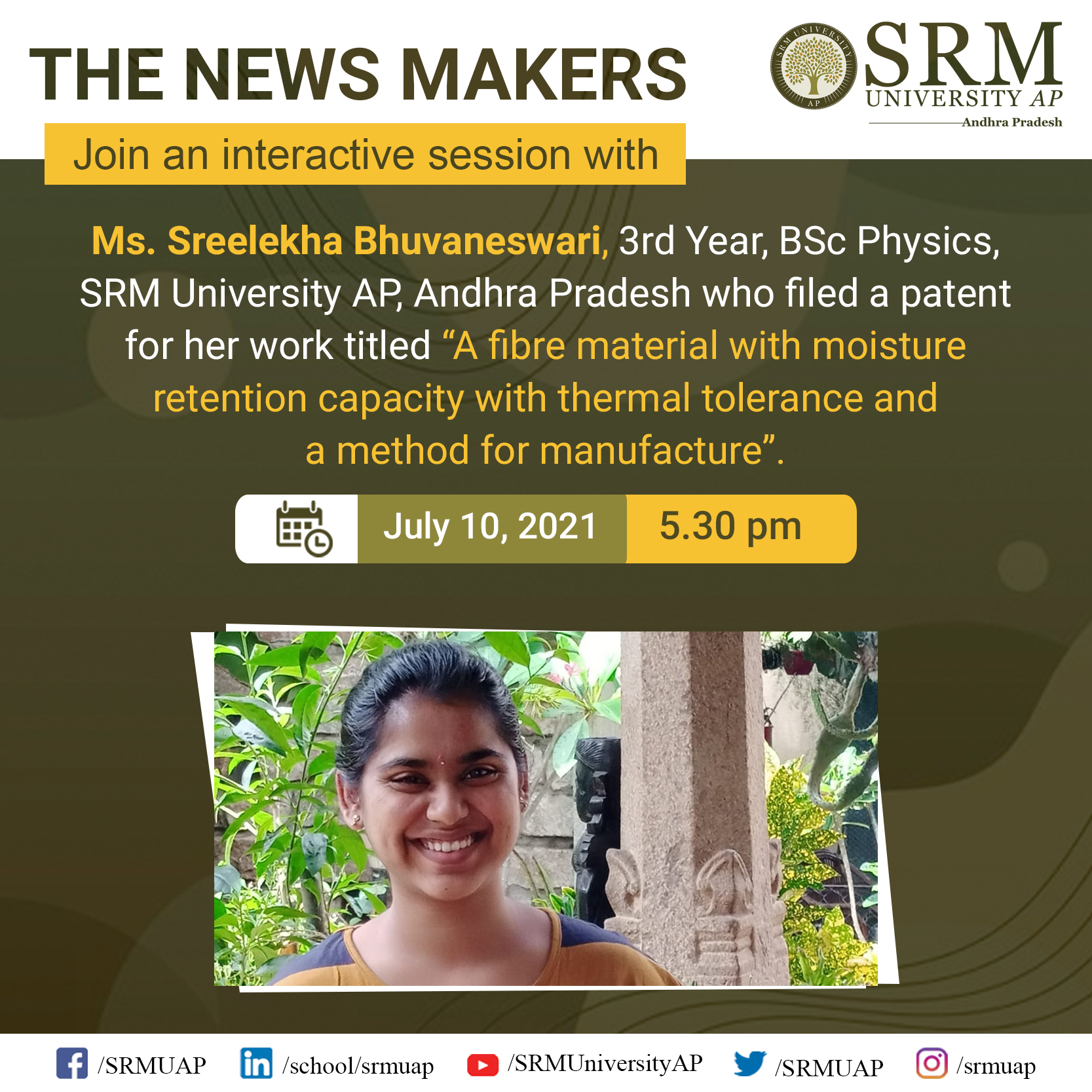 The Department of Students’ Affairs at SRM University-AP, Andhra Pradesh is all set to feature the brilliant Ms Sreelekha Bhuvaneswari in the upcoming segment of “The Newsmakers” scheduled on July 10, 2021, at 5.30 pm. Ms Sreelekha is a BSc physics final year student who brought laurel to the university by filing a patent for her work titled “A fibre material with moisture retention capacity with thermal tolerance and a method for manufacture” under the guidance of Dr Sabyasachi Mukhopadhyay, Assistant Professor in the Department of Physics, SRM University-AP.