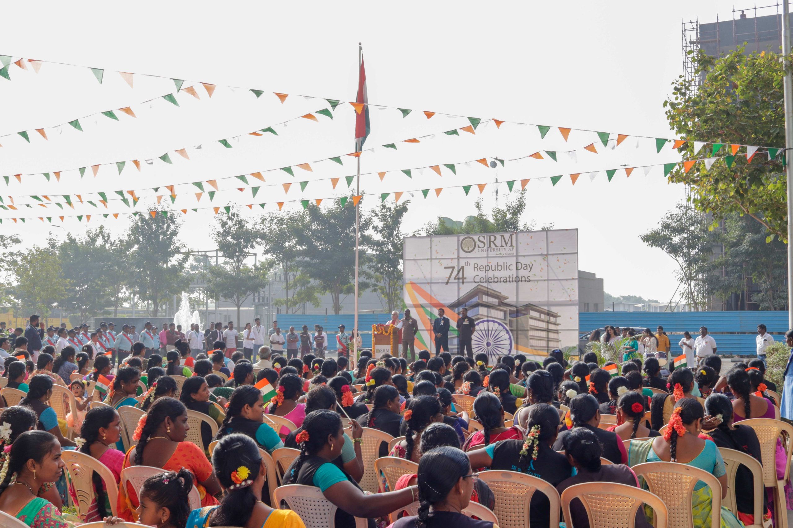 SRM University-AP celebrates the 74th Republic Day of our glorious nation with immense pride and zeal in commemorating the genesis of India’s constitution. Honourable Vice Chancellor, Prof. Manoj K Arora initiated the auspicious event by unfurling the flag, proceeding with the National Anthem and March Past. He explicated the significance of paying homage to our great nation and our brave leaders whose vigilance and valour contributed to forming a secular and republic country.