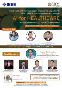 Department of Electronics and Communication Engineering, SRM University-AP, Andhra Pradesh organizes workshop on “Artificial Intelligence (AI) for Healthcare” in collaboration with IEEE-SRM AP Student Branch. Prof. D. Narayana Rao, Pro Vice-Chancellor will inaugurate the workshop on 25th July, 2020 at 9:30 am with the opening remarks. Dr. Muralikrishna Voonna, Managing Director, Mahatma Gandhi Cancer Hospital & Research Institute will deliver a Guest Lecture on “Impact of AI in Clinical Healthcare”. Further, during the session, Guest Lecturer, Dr. Rajiv Janardhanan, Director, Amity Institute of Public Health, Professor ACVB will be speaking on “Sustainable Healthcare: AI enabled platforms for Affordable and Accessible Healthcare Solutions”.