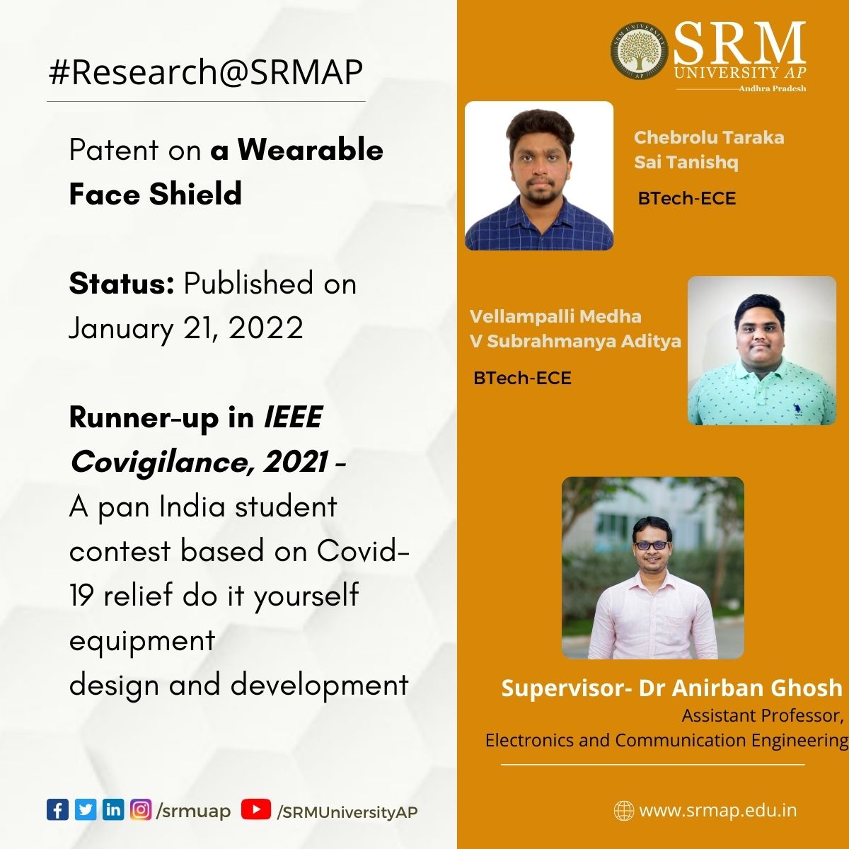 The Department of Electronics and Communication Engineering is proud to announce the remarkable achievement of the students Chebrolu Taraka Sai Tanishq and Vellampalli Medha V Subrahmanya Aditya. They have designed a wearable face shield and secured the second position in IEEE Covigilance, 2021 – A pan India student contest based on Covid-19 relief do it yourself equipment design and development, under the guidance of Dr Anirban Ghosh, and got a patent published for their prototype developed as part of the competition. The team also participated in the 4th Research Day organized by SRM University-AP and received a gold medal.