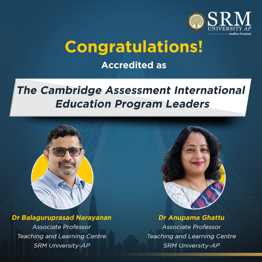 SRM University-AP educators, Dr Balaguruprasad Narayanan and Dr Anupama Ghattu from the Teaching and Learning Centre are now accredited facilitators under The Cambridge Assessment International Education Program Leaders. The Duo have earned their specialisations in the Teaching and Learning Program & Teaching with Digital Technologies Program respectively.