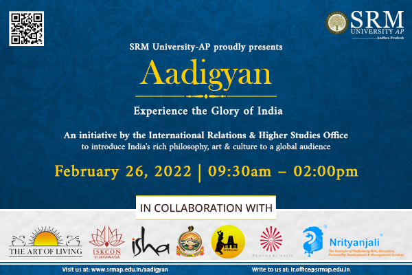 India is a treasure trove of knowledge. The International Relations & Higher Studies office at SRM University-AP cordially invites your esteemed presence to join the virtual launching ceremony of Aadigyan, an initiative to introduce India’s rich philosophy, arts, and culture to a global audience.
