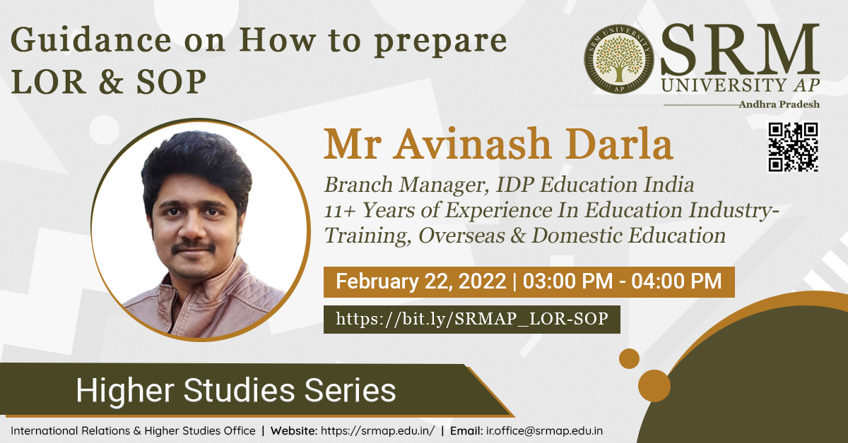 The office of International Relations and Higher Studies at SRM University-AP is organising a session with Mr Avinash Darla as part of the Higher Education Series to educate students on framing the LOR and SOP documents. This session will help you confidently present yourself and your capabilities while seeking entry for higher studies in any reputable institution. Join the webinar and learn how to deliver your best in every application that you sent.