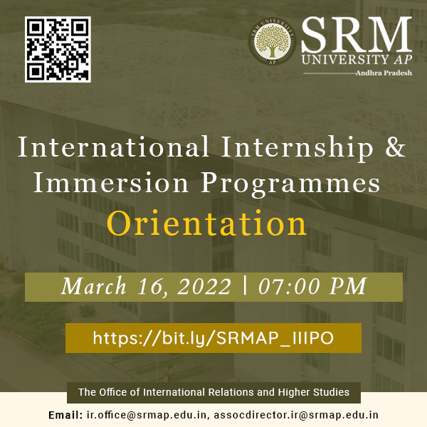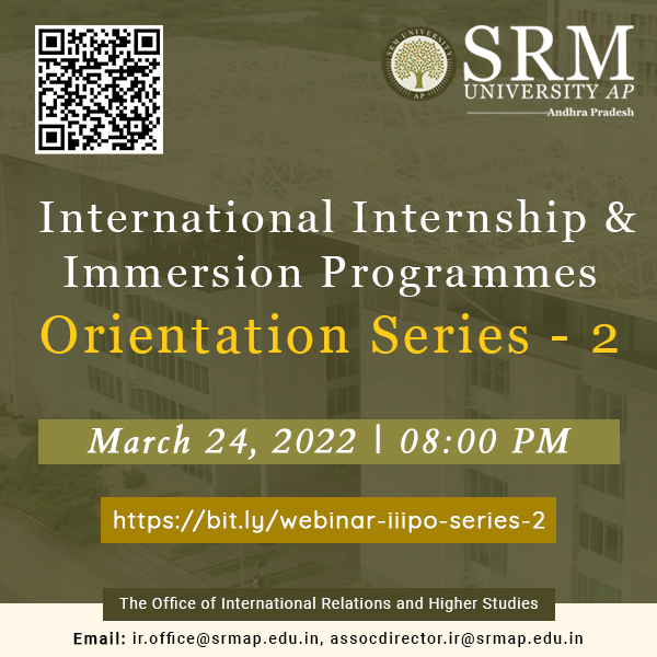 A webinar series on International Internship & Immersion Programmes is being organised by the Office of International Relations and Higher Studies at SRM University-AP. Interested students can gain a detailed overview of international programmes and their preparation procedures.