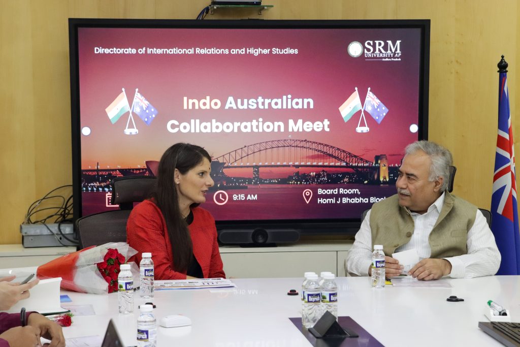 SRM University-AP played host to a dynamic and visionary Indo-Australian Collaboration Meet aimed at fostering academic partnerships and research collaborations between the two nations. The event featured a delegation led by H.E. Sarah Kirle, the Australian Consulate General. It occurred in the esteemed presence of Vice Chancellor Prof. Manoj K Arora and Registrar Dr R. Premkumar.