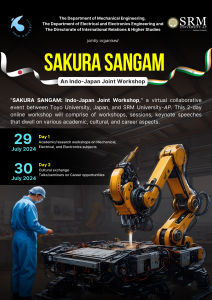 In a groundbreaking initiative, the Directorate of IR & HS, along with the Department of Mechanical Engineering and Electrical and Electronics Engineering, successfully hosted the “Sakura Sangam: Indo Japan Joint Workshop,” a two-day virtual event held on July 29 and 30, 2024. This workshop, organised in collaboration with Toyo University, Japan and supported by SRM Global Consulting, aimed to foster academic collaboration and cultural exchange between India and Japan.