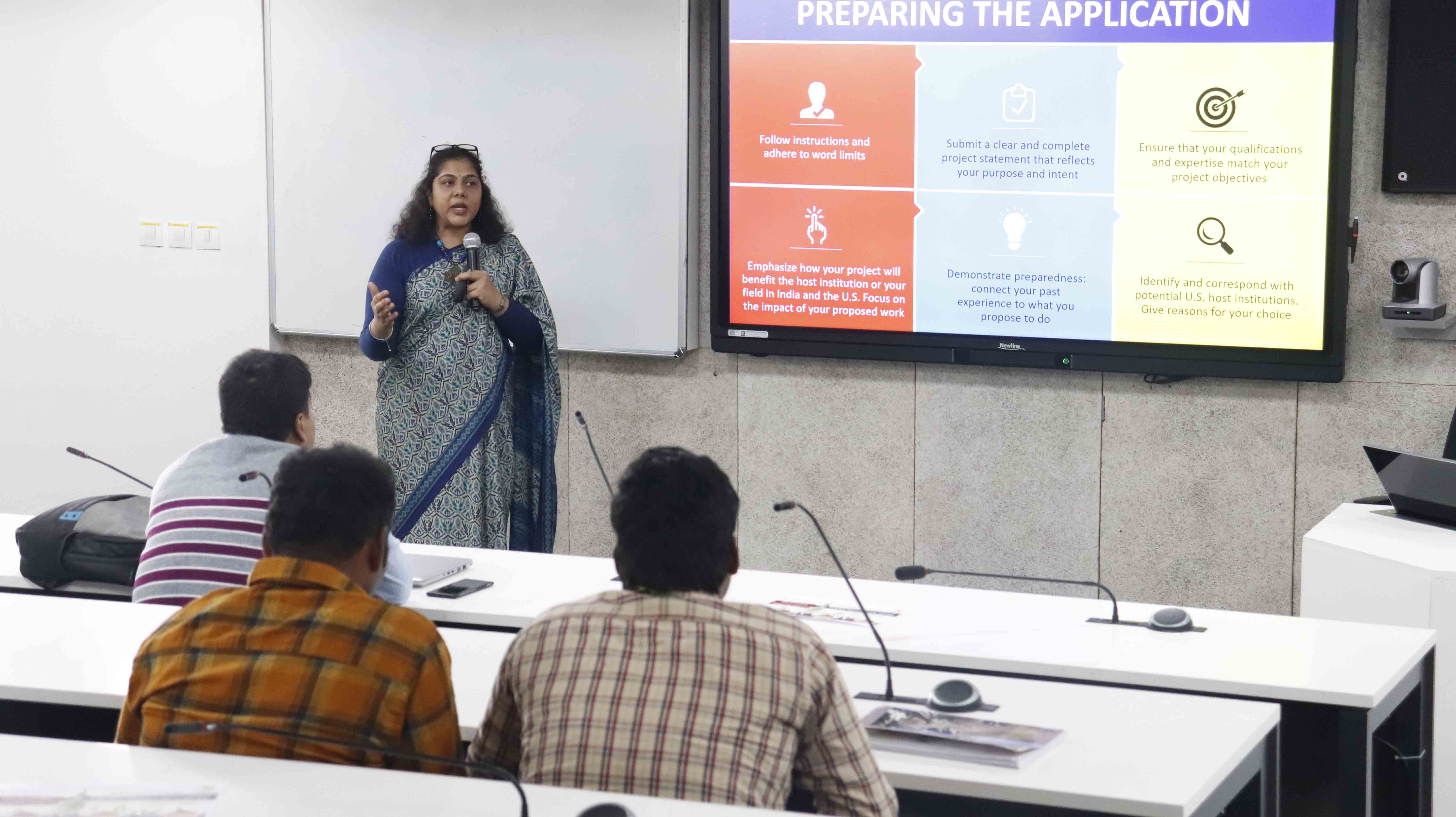 Dr. Monika Setia, Fulbright India, conducts a session with the researchers