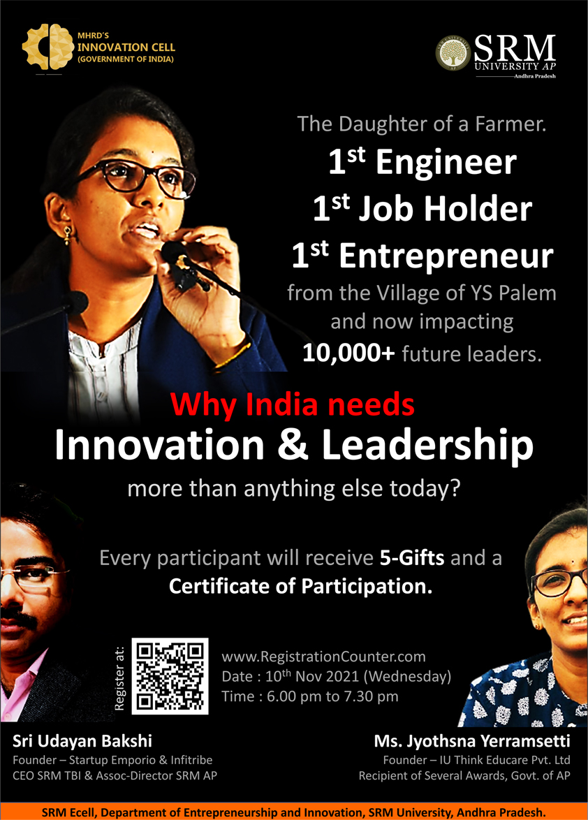 To nurture and cultivate innovation, there are no best-practice solutions. The structures and processes that many leaders employ instinctively to foster it are vital but insufficient. The Department of Entrepreneurship and Innovation at SRM University-AP is organising an influential session by Jyothsna Yerramsetti, CEO & Co-Founder- IUThink, on November 10, 2021, at 6.00 pm to promote and integrate innovative leadership among students. All participants will be given various gifts and certificates and participation.