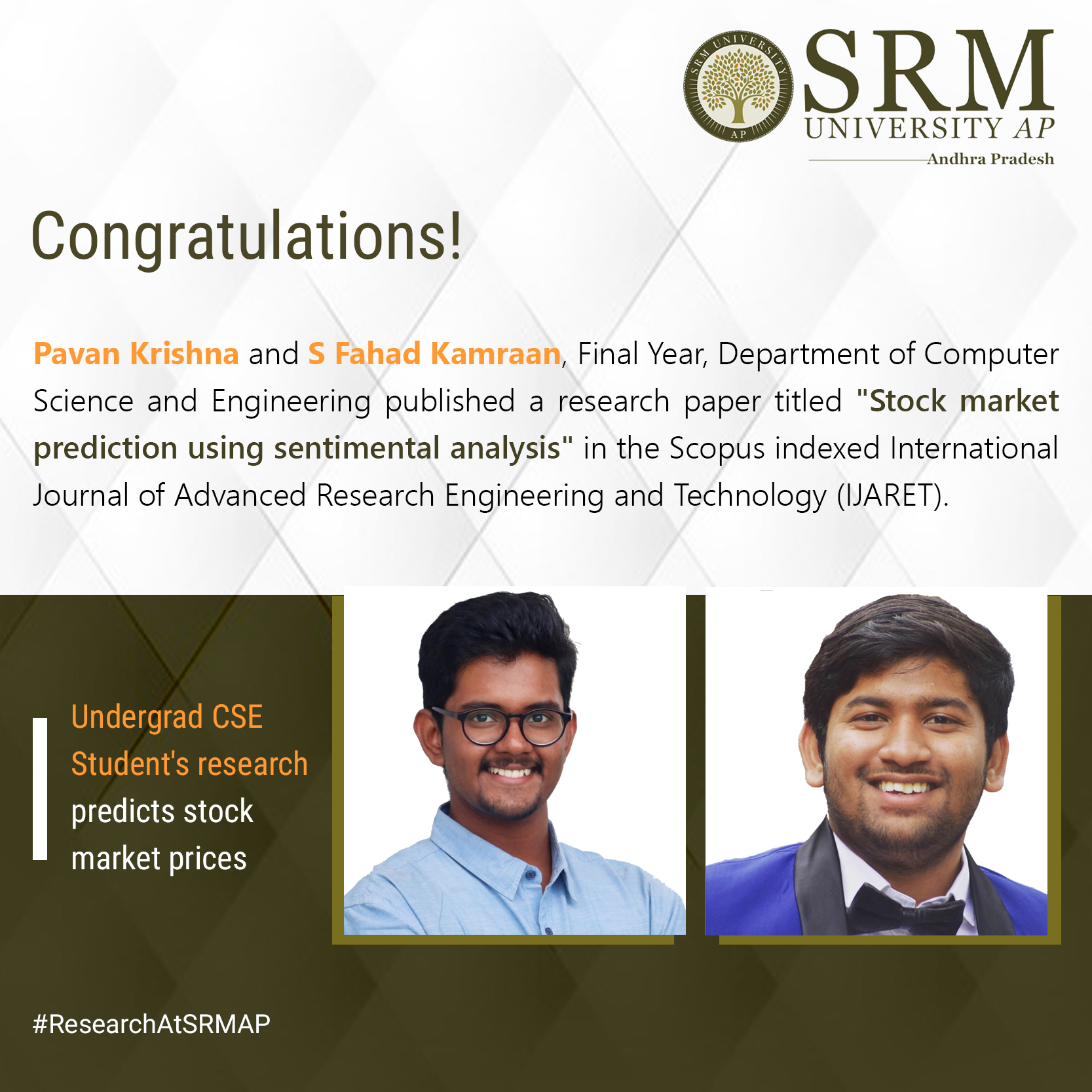 Pavan Krishna and S Fahad Kamraan, guided by Dr Priyanka, Department of Computer Science and Engineering, SRM University-AP, Andhra Pradesh, successfully published a research paper titled “Stock market prediction using sentimental analysis” in the Scopus indexed “International Journal of Advanced Research Engineering and Technology (IJARET)” on March 2021. Being the students of the Department of Computer Science and Engineering, both researchers have apt knowledge on the sentimental analysis commonly known as opinion mining or emotion AI led to the successful execution of the research project.