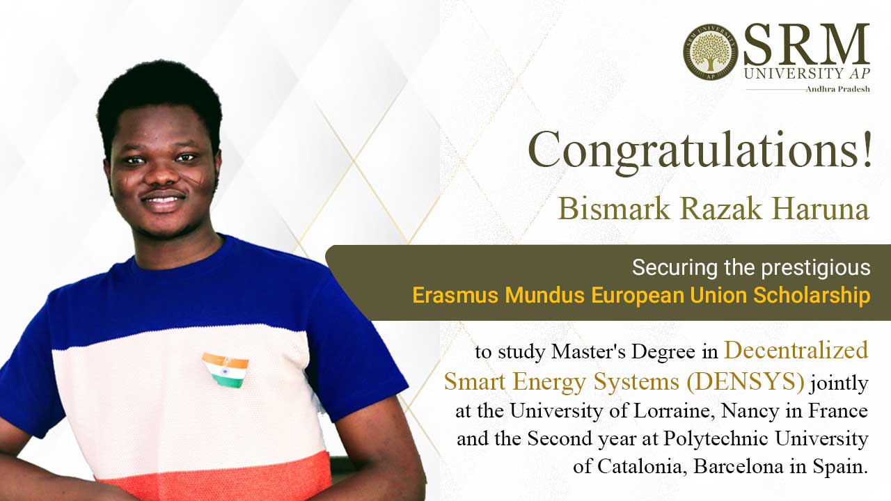 Since its inception, SRM University-AP, Andhra Pradesh, has retained its exalted heights of excellence and brilliance. Avid students over the years have brought laurels to the organisation with impressive research work, outstanding academic performance or Guinness World Record for spectacular artistry. Bismark Razak Haruna, a B. Tech Final Year Student at the Department of Mechanical Engineering, is deemed to be bestowed on the highly prestigious Erasmus Mundus scholarship. The globally acclaimed European Union-funded scholarship will help Bismark pursue the joint master’s degree programme in Decentralised Smart Energy Systems (DENSYS) in renowned universities of Europe.