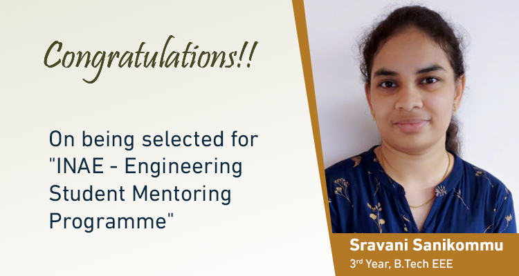 The Governing Council of the Indian National Academy of Engineers (INAE) designed the mentoring programme to encourage future engineers in the nation to make significant contributions to engineering and technology for holistic solutions. Due to COVID-19 pandemic, online internship is also available. Ms Sravani gets an opportunity to work online in the host institution in the field of power electronics under the able mentorship of INAE Fellow Prof B G Fernandes, Electrical Engineering, Indian Institute of Technology Bombay (https://www.ee.iitb.ac.in/wiki/faculty/bgf) for 2 Months. She extended her gratitude to Dr Tousif Khan N, the Head of the Department, and Prof Sastry V Vedula, a distinguished visiting professor in the Department of Electrical and Electronics Engineering, as well as an INAE fellow, for initiating her into the mentoring programme and providing constant guidance.