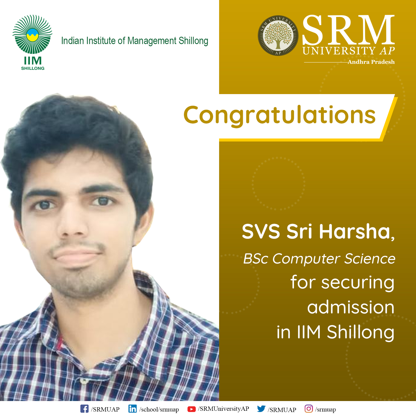 SVS Sri Harsha, a final-year BSc Computer Science student at SRM University-AP, Andhra Pradesh, receives admission offers from India’s top business schools. As an extremely meritorious student, he has qualified CAT, XAT, NMAT and SNAP. He scored a percentile of 98.9 in CAT and has got the opportunity to study MBA at any one of the IIMs in Shillong, Kozhikode, Raipur, and Bodh Gaya. In addition to these apex management institutes, he has also received offers from XLRI-Xavier School of Management, Jamshedpur; Institute of Management Technology, Ghaziabad; NMIMS, Mumbai; Symbiosis Institute of Business Management, Pune; and International Management Institute, Delhi. He hails from Vijayawada and completed his schooling in Delhi.