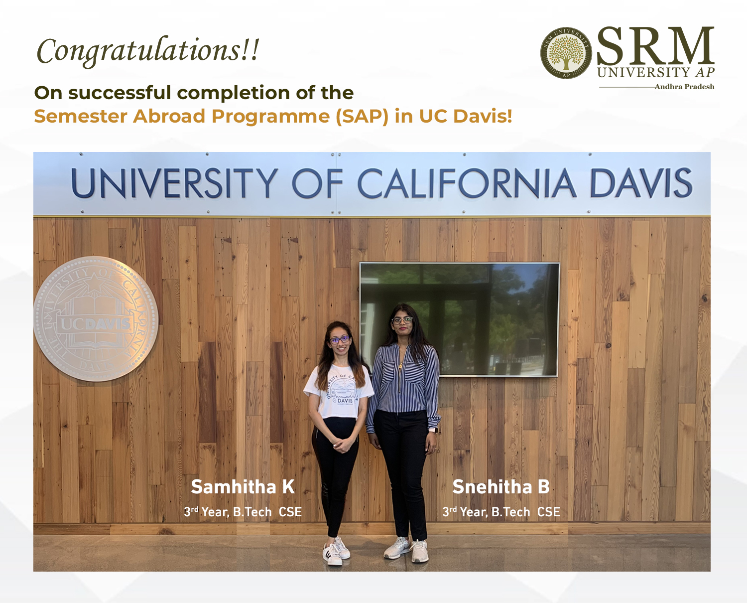 Barukula Snehitha Naga Sai and Kamma Samhitha are two brilliant third-year Computer Science Engineering students selected for the enviable Semester Abroad Programme (SAP) at the University of California, Davis. The students received a partial scholarship from SRM University-AP to complete their final semester abroad with the global study programme at UC Davis. The selection process for the semester abroad programme generally starts at the end of the 3rd and 5th semesters when our university carries out student interviews. A minimum of 8.7 CGPA is required to be eligible for the SAP scholarship and the programme focuses on building engineering design processes along with developing behavioural and communication skills of meritorious students.