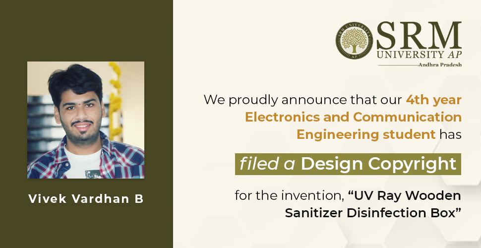 Bitragunta Vivek Vardhan, a final year student from the Department of Electronics and Communication Engineering, has filed a design copyright for developing a “UV Ray Wooden Sanitizer Disinfection Box”. This is a safe chemical-free product designed to disinfect the surfaces of items. In this period of the Covid-19 pandemic, it has been difficult to sanitize mobile phones, tabs, laptops, car/bike keys, wallets, currency/coins, credit/debit cards, newspapers, pens, goggles, spectacles, accessories, milk packets, bakery items, water-absorbing products, delivery packages, toys, clothes etc with liquid sanitisers or else with water.